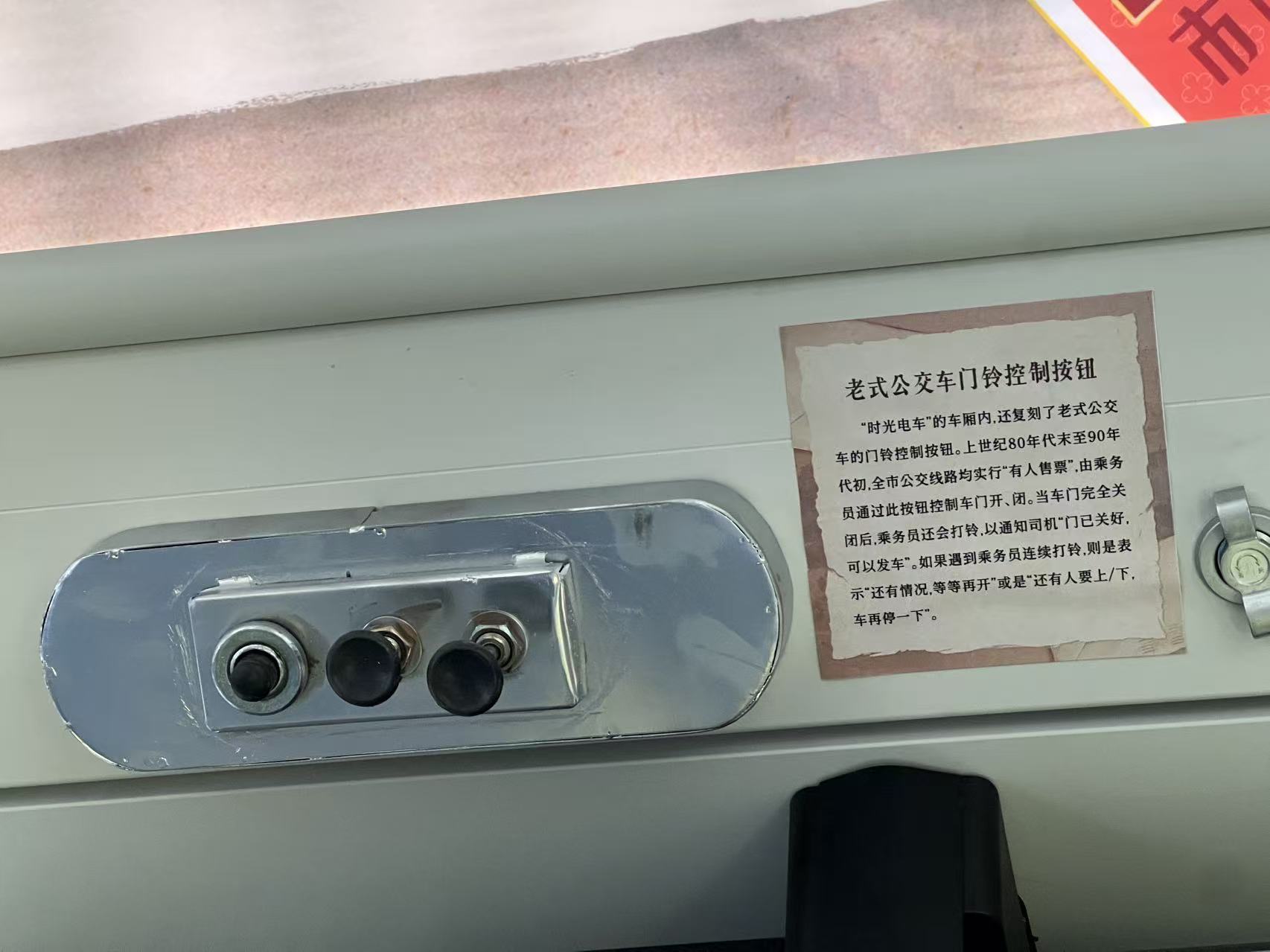 车内设有老物件展示区,展出由市民捐赠的“票夹、月票、摇手柄”等实物,承载了几代杭州人的出行记忆。车内挡板、插片上也印有电车发展历程的图像与文字,系统梳理了从“辫子车”到即冲式纯电动车的技术演进与服务升级。
